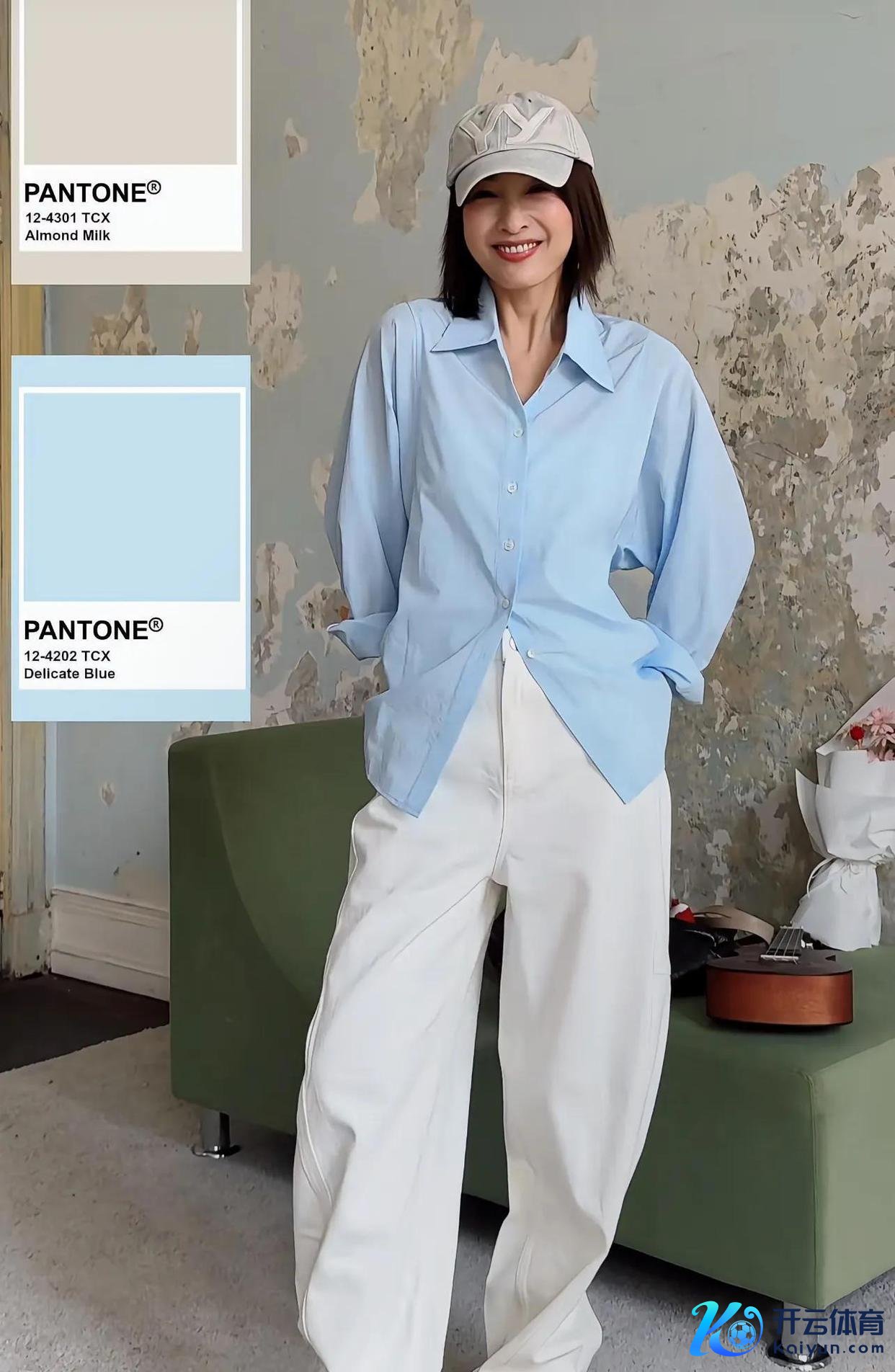 Look1:蓝色衬衫搭配白色直筒裤,崭新又显年青。